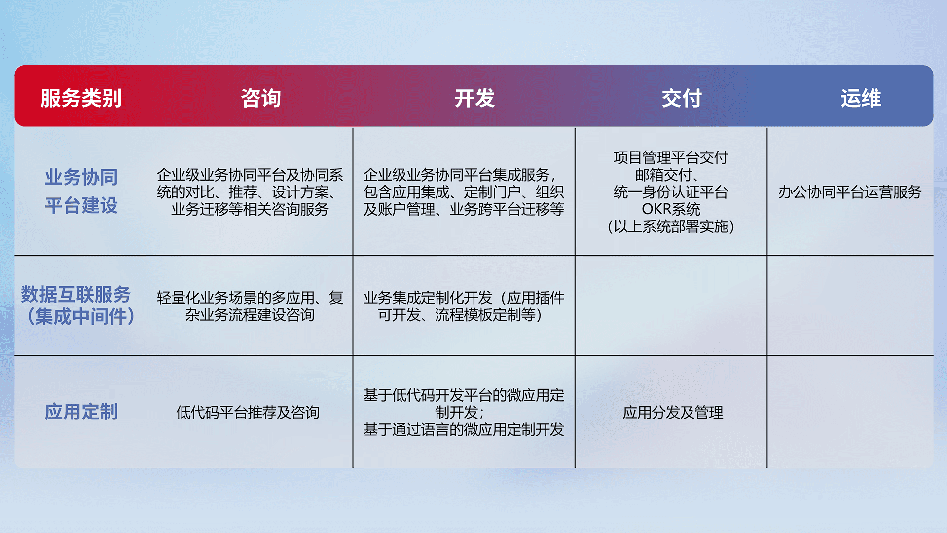 针对钉钉、、、企微、、IDaas等平台级产品提供产品的规划、、方案、、、交付、、、、定制化开发等服务,,实现如统一协同办公、、智能客户服务、、、混合会议管理、、智能数据查询、、、等业务场景,,,,实现数字化转型。。